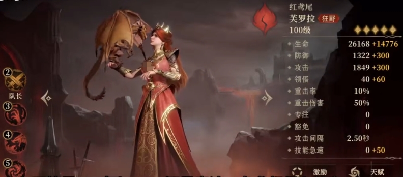 红鸢尾·芙罗拉,作为狂野流派中的龙妈,她是火焰元素的输出担当,她不仅自身拥有强大的火焰技能,还能提升整个队伍的战斗力,她的队长技是一项强力的增益技能,能够在所有战斗中为己方队友提供30%的攻击力加成,此外她还有一项名为契约仆从的被动技能,每当队友触发狂野判定成功时,她都会召唤出一只魔宠自动向敌方目标发射火球。