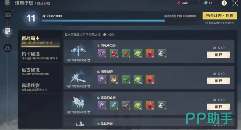 除了常规的每日任务获取阅历外,游戏中还有多种独特的玩法可以帮助玩家快速积累阅历,例如玛卡秘境、远古秘境及高塔残影这四种玩法,都被巧妙地融入了成长导航之中,这些玩法不仅充满挑战乐趣,还能让玩家在消耗体力的同时,获得对应的丰厚奖励。