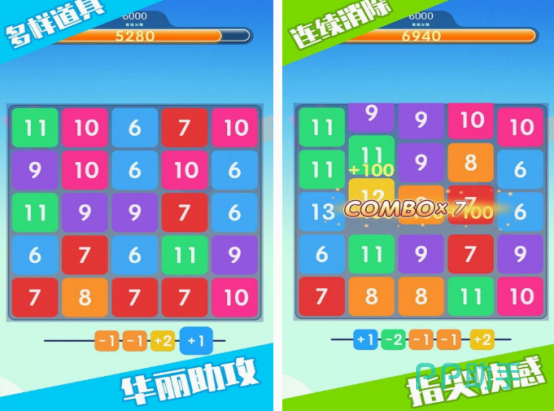 在此休闲的数学游戏中,主要就是利用对数字进行合成的方式进行体验。在玩的时候,你需要将数字放在正确的位置上,如果有三个或三个以上同样的数字,连在一起以后,就可完成合成,获得数值。相对于普通的消除游戏或者是算术类型的,这游戏将这两种元素融为一体,你需要面临很大的挑战,要为了不断的获得高分而合成数字。