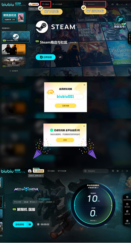游戏中还会有趣味性的多人在线合作类模式,玩家就可以选择和其他的玩家一起去联手,然后面对强大的boss。但为了避免在游戏中的卡顿,可以选择一款加速器。现在还可以领取免费加速时长,例如新用户在第1次注册之后就有一个3小时的免费礼包。要想获得更久的免费时长,玩家此时就登录加速器的页面,找到活动的入口输入复制口令【biubiu001】就能延长72小时,两种方法叠加在一起,一共是免费75小时。