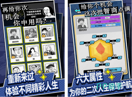 这款你可拥有重新来过体验精彩人生的游戏中,让玩家体验一下,与现实生活中完全不一样的人生。尤其是现实生活中,比较失败的情况下,通过这款游戏,你能选择8种不同的人生状态,一开始只是普通人,但是通过各种选择以后,你可以及时的进行尝试,具备有趣,又充满着惊喜的玩法内容,也是休闲又益智的。