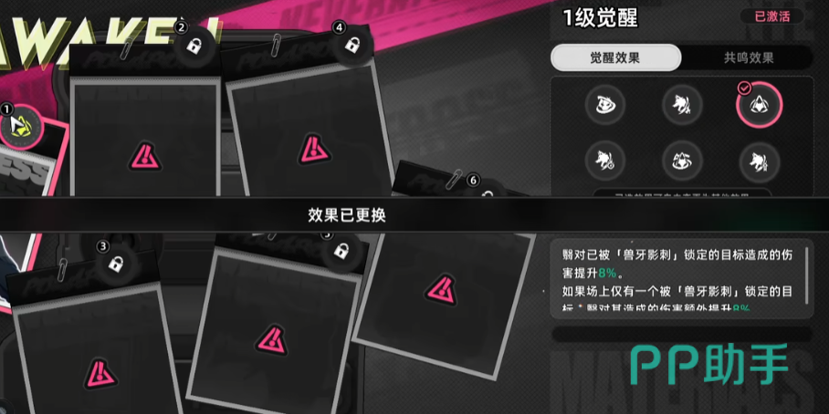 就是角色的命座,命座效果是可以自选的,以狼哥为例,抽出来是一命角色,觉醒效果却有6个,点击头像上方的圆圈,就可以选择想要的命座,之后完成变更,除了自选之外,抽到了3命6命之后,就会有额外的两个命座效果可以触发。