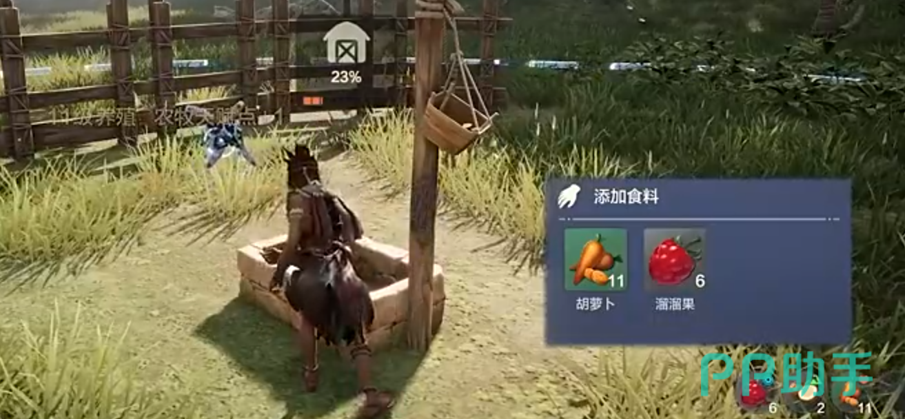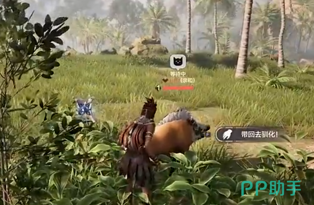 耐心等待吃下后,小猪就会变成亲和的状态,这个时候我们再靠近它,就会出现一个带回去驯化的选项,点击猪就会乖乖跟着我们走了,最后把它带到栅栏的虚线范围内就成功了,这个时候能看到它自己在范围内觅食。
