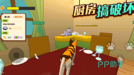 玩家在这里将要扮演的是一只调皮捣蛋的猫咪,虽然有非常可爱的样子,但是独自在家时总是对家中做出了很多的破坏行为,比如将所有的锅碗瓢盆全部摔坏,甚至还会在每个场景中做出各种各样的破坏行为,让主人对其无可奈何,操作方式极其简单,手机屏幕上都会有虚拟的控制按键,只要点击屏幕就能完成破坏。