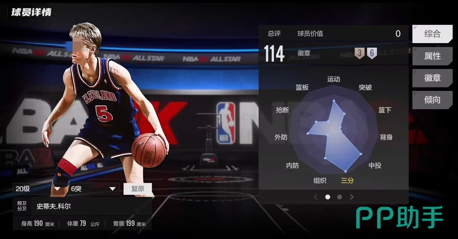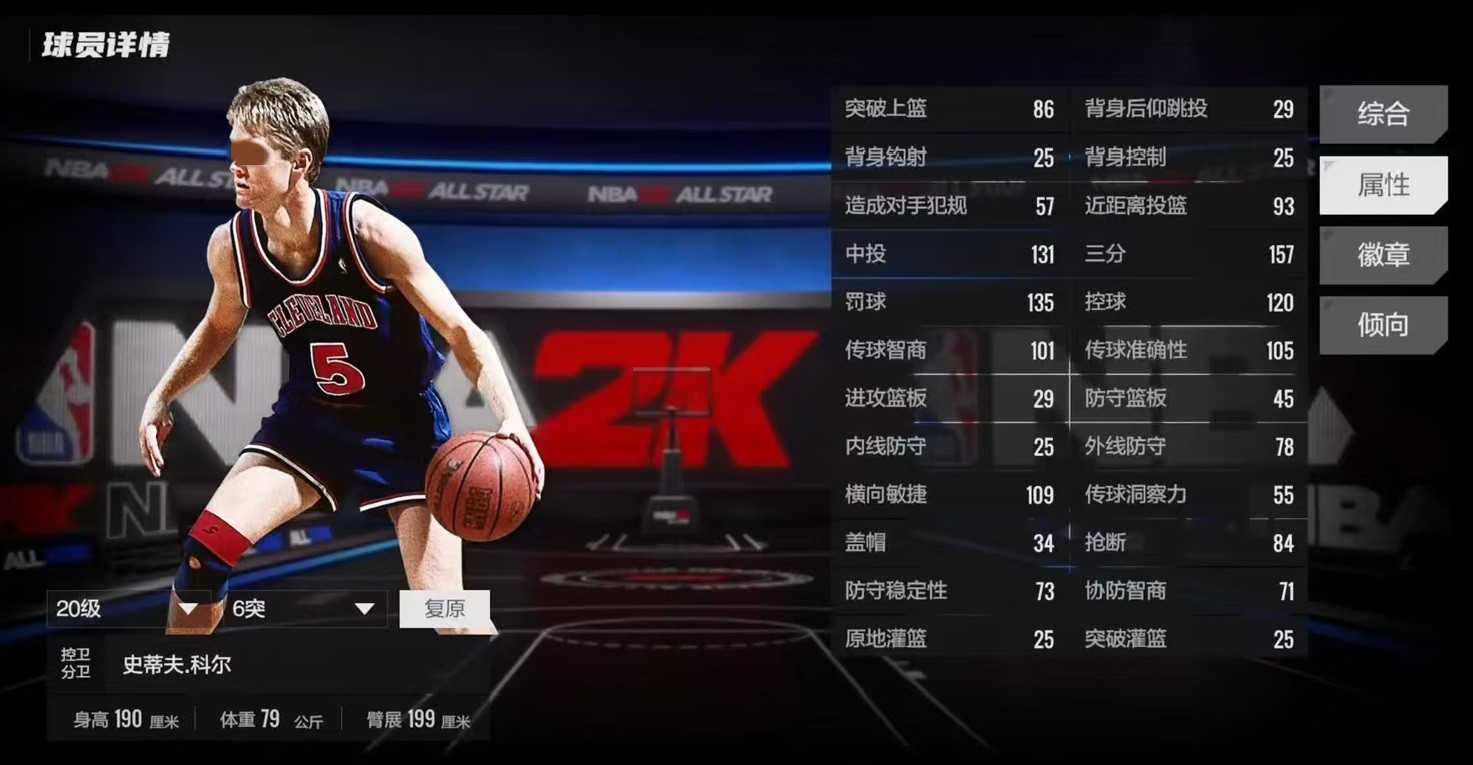 其他属性方面,120控球和105传球,也能客串持球组织。109横移和107速度,在后卫里面属于中等水平,并不算非常突出。他的防守绝对是自身的一个短板,外防仅有78,通过这个面板数值已经非常清楚了,科尔就是一个很典型的球员。徽章方面也很大方,给了历史球员很大的优惠,它具有银强投手,银接球投篮手,银底线三分手,这三个徽章非常契合无球射手的定位。其他徽章还有铜三分特工,铜保持警惕。还有银关键射手,能够在关键的时间内成为拯救球员球队的存在。再加上银射程无限,赋予了远程三分终结比赛的可能性。