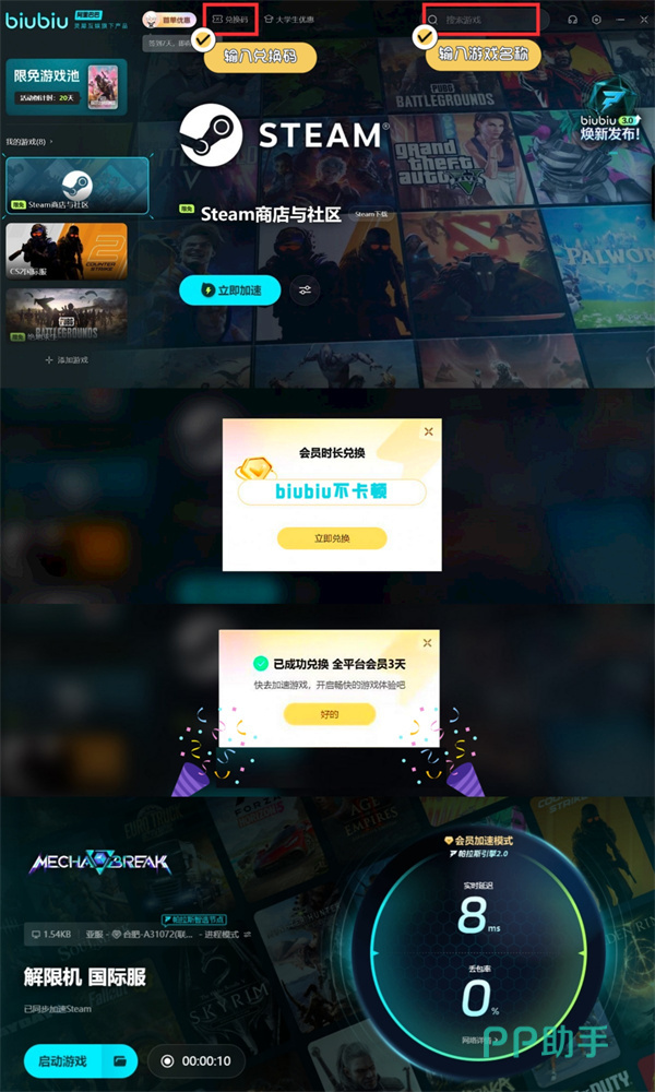 若是各位担心自己游戏过程中会遇到卡顿以及掉帧等方面影响,包括现在访问steam出现了错误代码,或是打不开等现象,那么使用biubiu这类工具来稳定运行就很合适了,现在新用户登陆更是能获赠3小时限免加速福利。