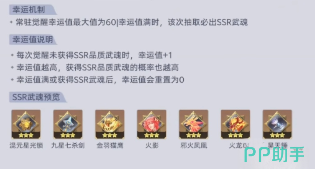 抽卡系统是游戏中获取稀有魂师和武魂的重要途径,每次觉醒十次可以提高抽卡概率,当幸运值满时,下次抽取必定获得一个SSR品质的武魂。幸运值积累到最大值60后,下次抽取必定获得SSR武魂。玩家可以通过日常任务和活动积累抽卡资源,当幸运值满时,可以一次性抽取多个SSR武魂,提升魂师的战斗力。