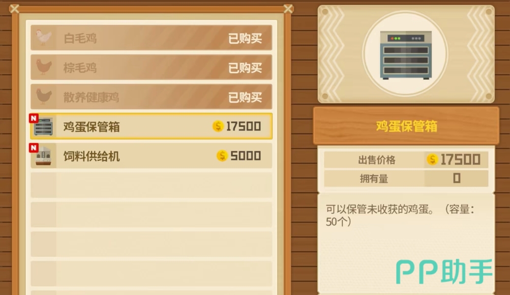 倘若玩家们觉得每天都来捡鸡蛋有些麻烦,也可在养鸡场升级任务触发后,买下一个鸡蛋保管箱。它能将每天产出的鸡蛋保存好,待玩家来的时候一次性全部拿走,但它的上限只有50个,各位需根据所养的鸡的数量计算好每天的产蛋量,在快到达上限时来清理一次。