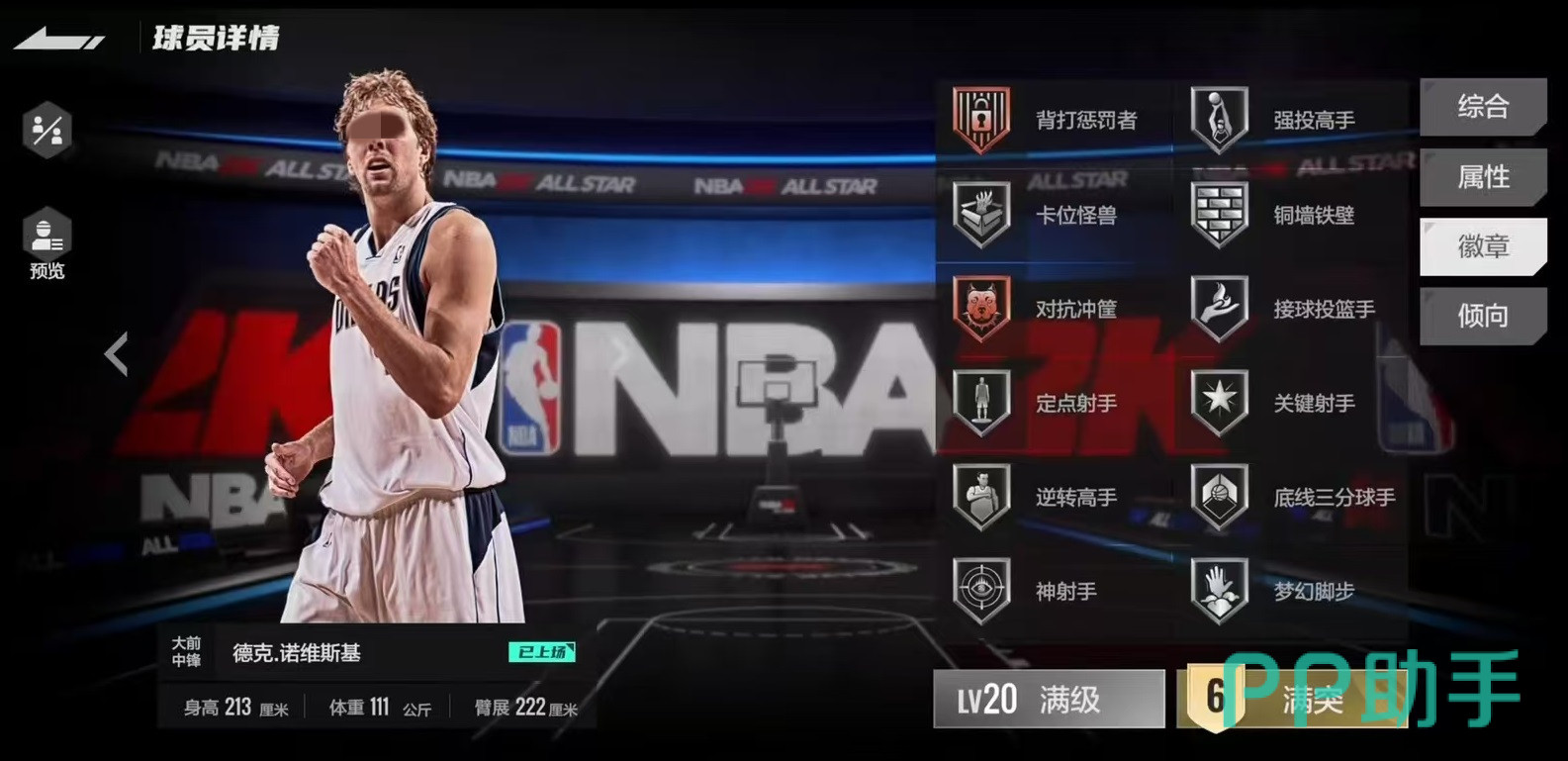 接下来看一下徽章,诺维茨基的徽章非常豪华,看上去满满一片银色,夹杂着一些铜色徽章,这些徽章既代表了策划对他的肯定,也代表了在游戏中的强大。因为银色徽章确实太多了,所以小编也只能选择几个介绍,例如强投高手,卡位怪兽,接球投篮手,定点射手,关键射手,底线三分球手,神射手等,这些徽章很多球员只要有一两个就已经非常强大,而诺维斯基全都具备。
