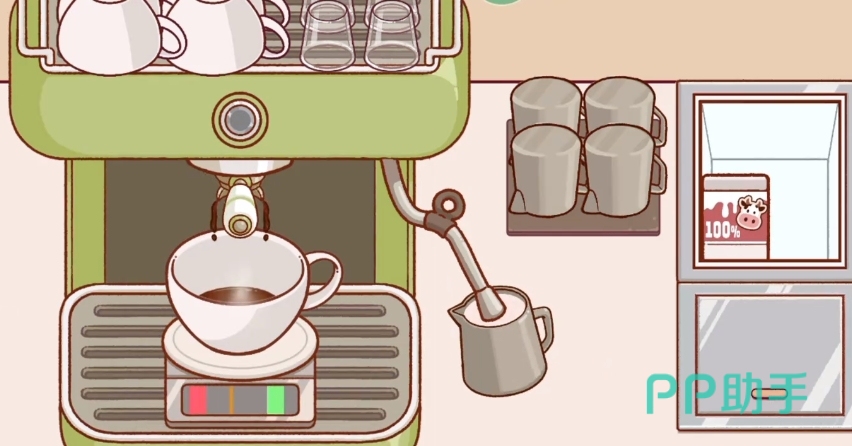 在经营日的第一天,玩家只能获得基础的咖啡机,当有60云朵币的时候就能升级为绿色“抓哇风格”咖啡机,这个咖啡机通体绿色,多数以原型为造型,比较可爱。想要更加高级点的话就是价值300钱币值的豪华级别的咖啡机。