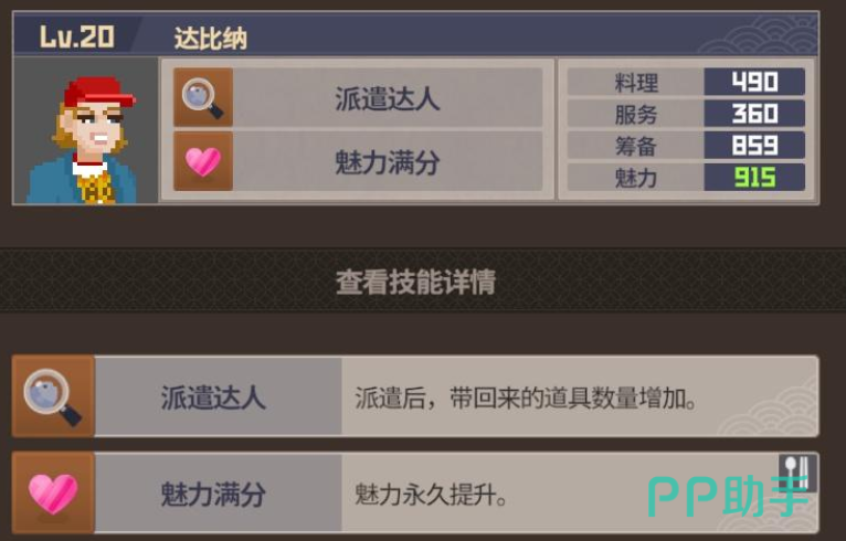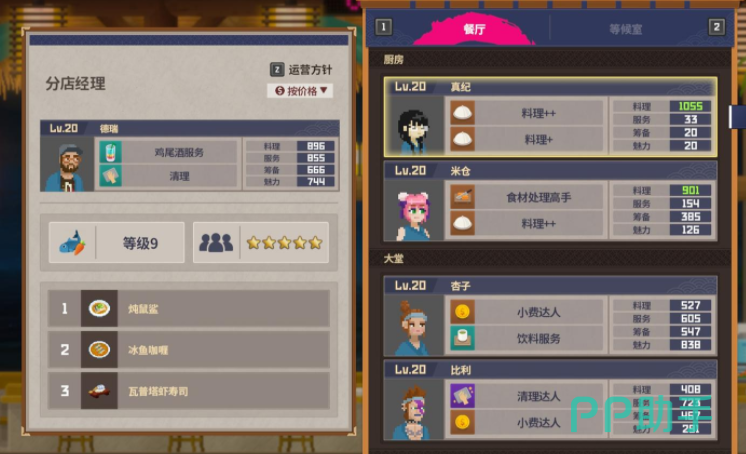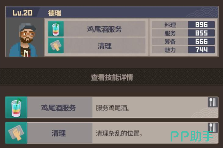 除了主店之外,后期还可以开设分店,饭店这里也需要有相同的配置,最推荐作为分店大堂经理的就是德瑞,这个角色各项分值都是比较优秀的,并且主要可以完成鸡尾酒和清理服务,等这个角色提升到15级之后,还能解锁冰鱼咖喱这道菜,这个角色的技能也表示,不管是在人多的时候充当服务员,还是人少的时候冲他大他经理都是可以的。