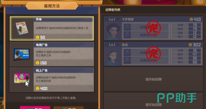 一般前期是不需要员工的,玩家和朋友两个人就能维持店铺的日常工作,后期随着店铺的知名度越来越高,来店铺里点餐的顾客也会更多,这时候在员工的选择上尤为重要,游戏里总共有21个员工,想获得这些员工的话需要通过不同的雇佣方式,其中最推荐的就是通过电视广告的方式去雇佣这些员工,相对来说比较划算,而且应聘的这些员工级别也比较高。