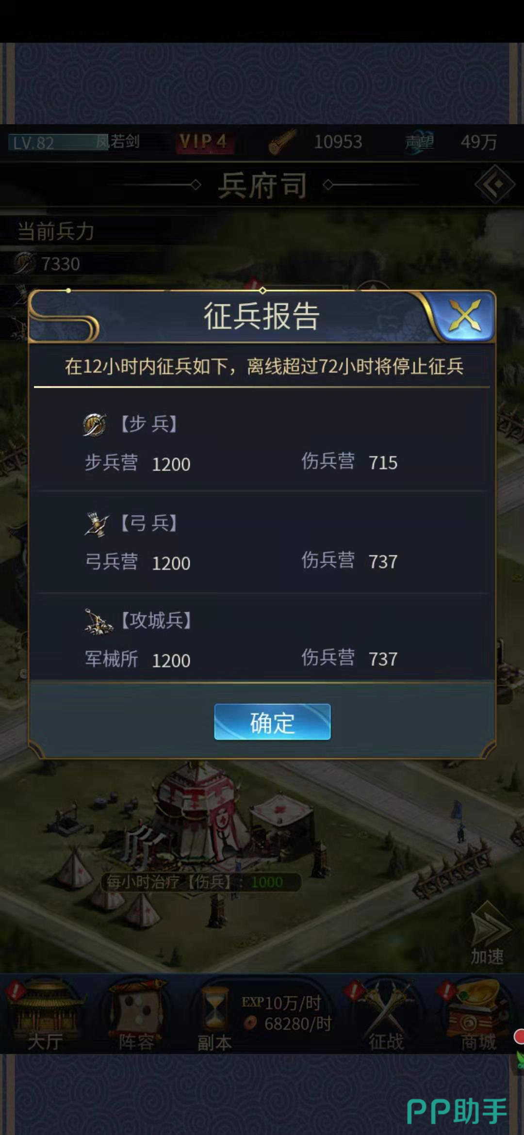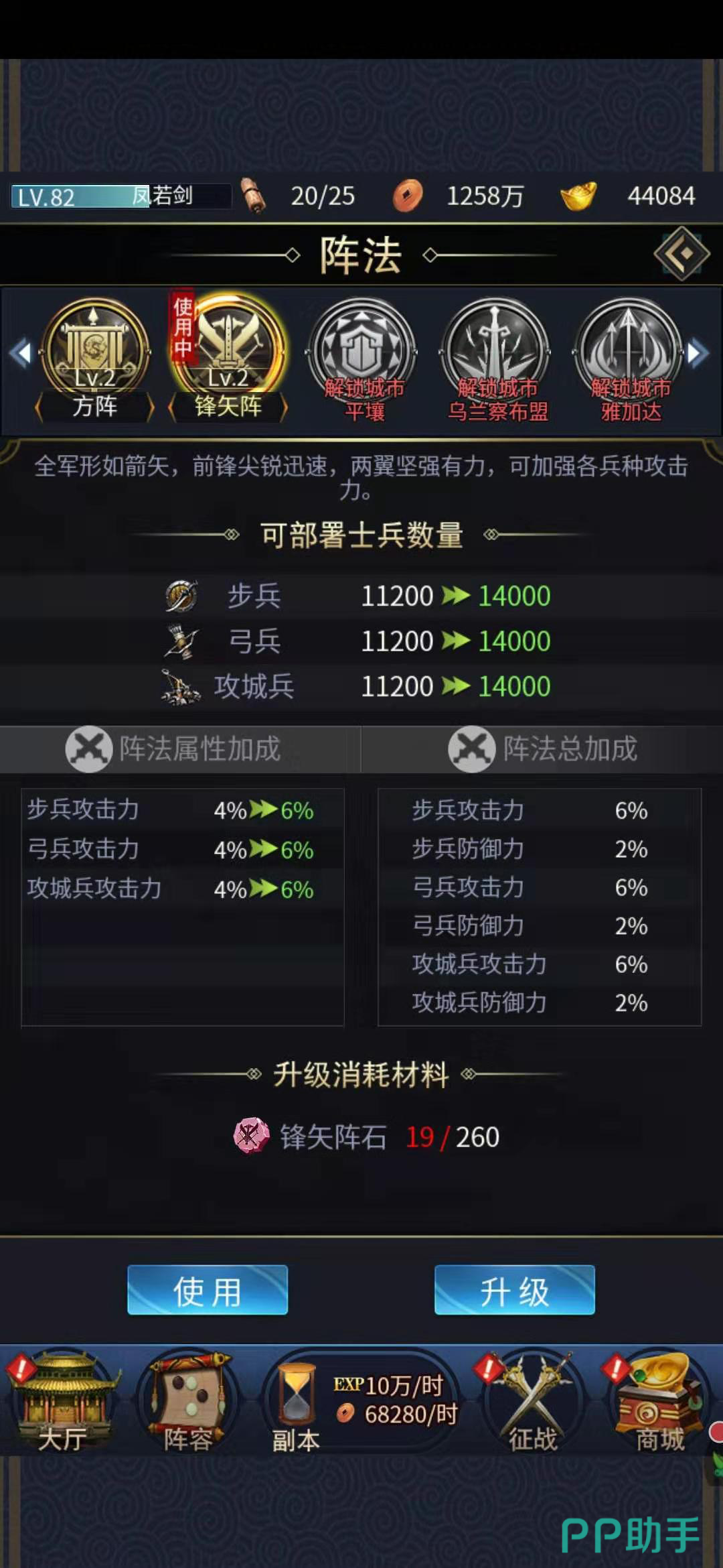 士兵训练出来之后不是一定都可以上阵的,每次战斗可以出战的士兵数要根据阵法的等级而定,等级越高可以上阵的士兵也就越多,升级阵法需要用到阵型石。不同的阵型对不同兵种的加强也不相同,大家要根据敌方的具体情况来选择合适的阵型,这就要求我们必须培养多种阵法来应对不同的需求。