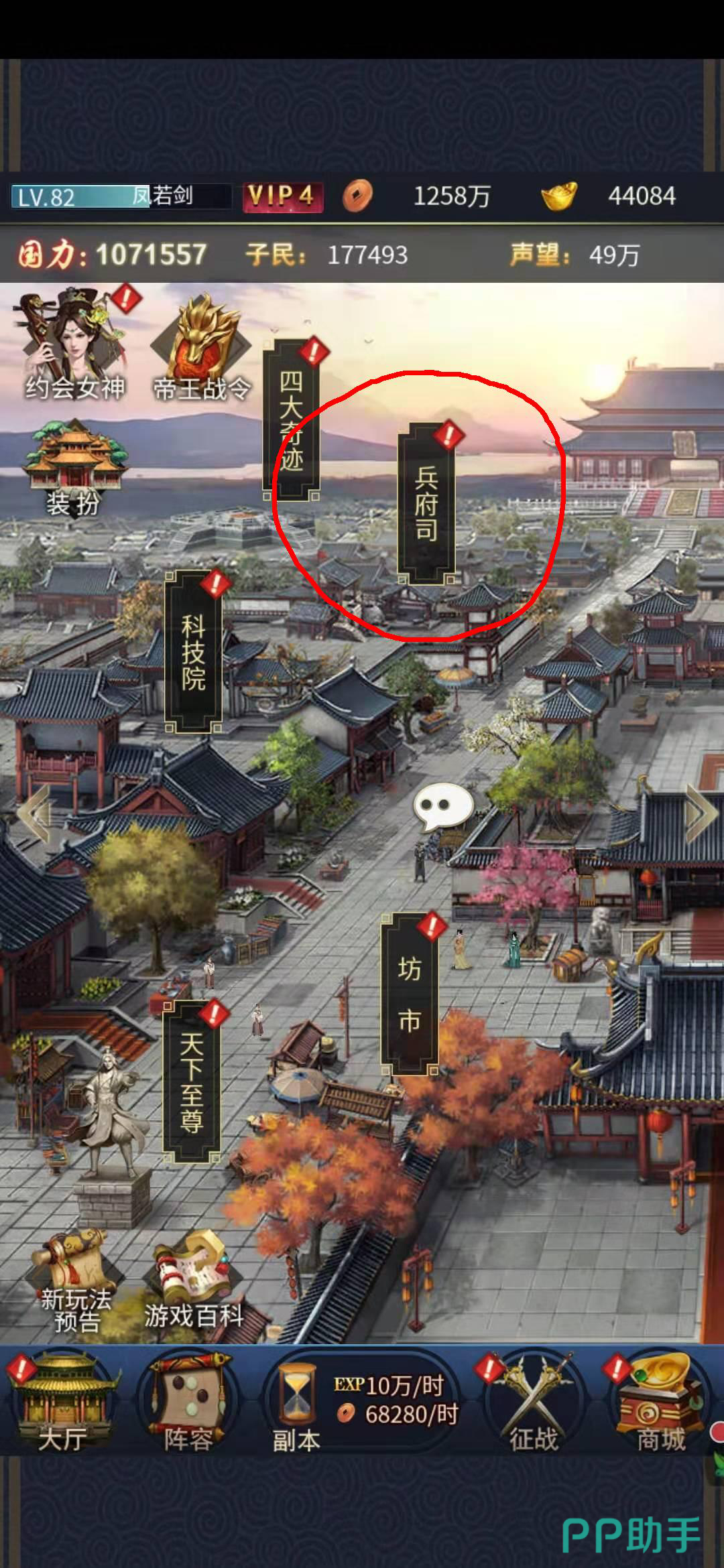 很多玩家对皇帝养成计划的士兵训练方面比较陌生,其实训练士兵的功能也是随着征服世界的功能一起开放的,在游戏主界面点击王城功能,在王城中可以找到兵府司的建筑,点击就可以进入到兵府司的官衙中了,在这里我们就可以训练士兵了。
