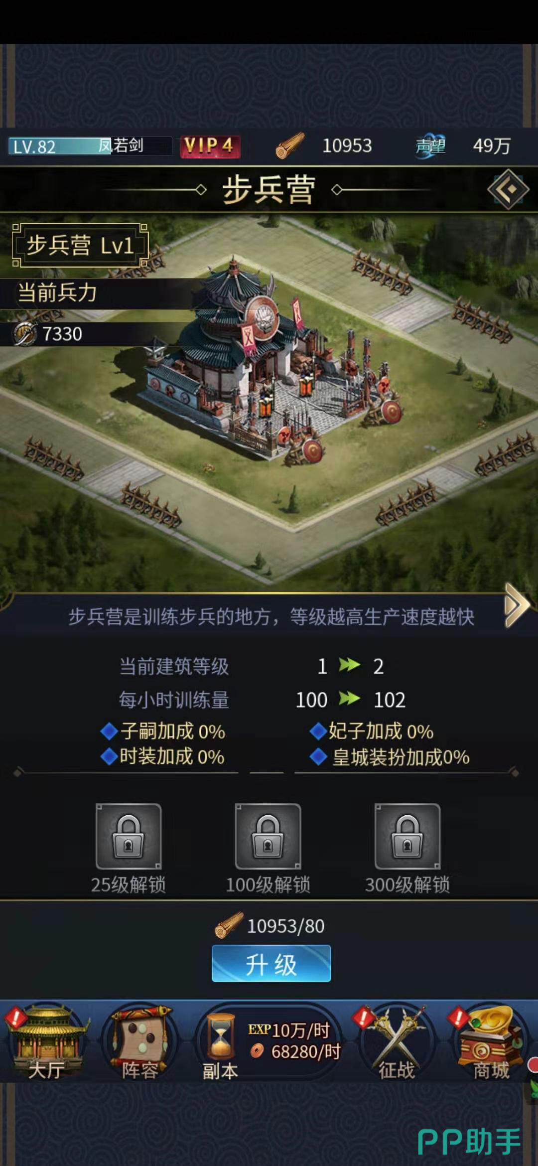 在初始的时候每个兵营都只有一级,一级兵营每个小时可以训练100名士兵,可以通过消耗木材来进行升级,等级越高每小时训练的士兵也就越多。木材可以通过征服世界过程中的战争来获得。