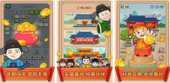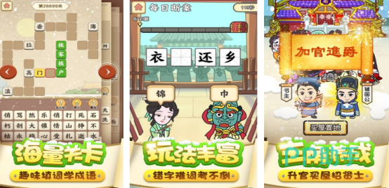 唯美的卡通画面以及丰富的关卡内容,还以成语闯关为核心玩法,这里的关卡难度也应有尽有,从简单到复杂。玩家在闯关的同时,还能够挑战自己的极限,也验证自己的知识储备量,此游戏秉持着寓教于乐的核心准则,这里包括的玩法有很多,比如招纳贤士以及买房置地等多样化的玩法。这里也包括了成语填词以及成语接龙等多种趣味性的玩法。