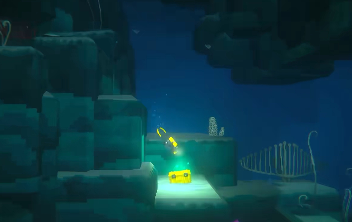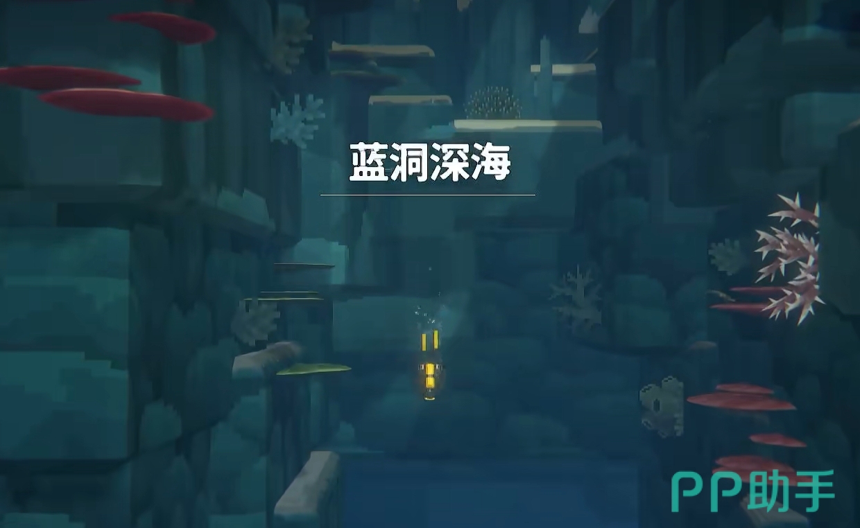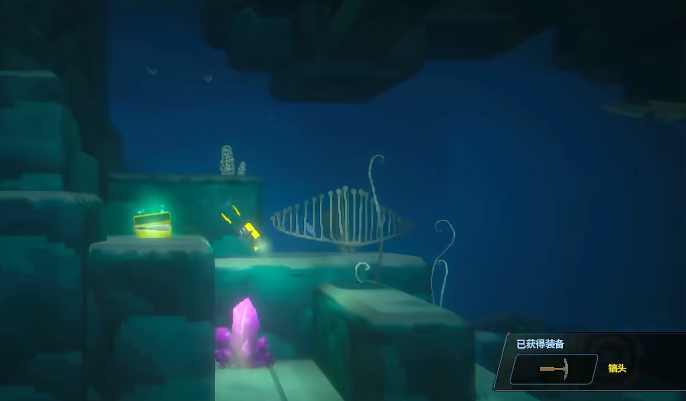从船上潜入海底后,玩家先来到蓝洞深处的入口,并朝着深处直线下潜。在离入口不远处会有一个宝箱,可固定拿到紫外灯,继续往下潜还会有一个宝箱,可开出开采紫水晶所需要的镐子。若是该宝箱没能开出镐子,可在上方的小路开着紫外灯一路照过去,来到另一边继续找宝箱开镐子。
