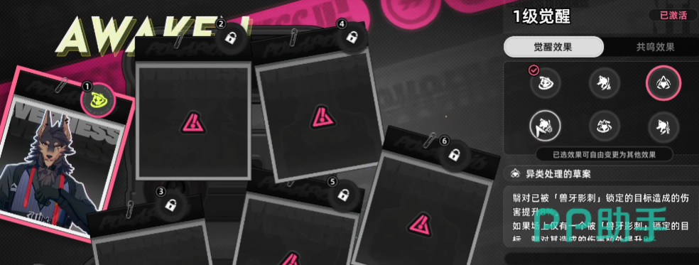 异环里的觉醒其实就是类似命座的东西,异环有一个很好的点就是命座效果是可以自选的。以“翳”这个角色为例,1级觉醒的效果有6个,可以选择想要的效果去变更。