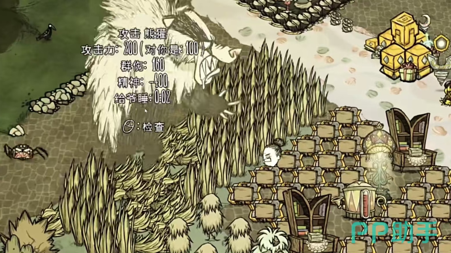 这个boss掉落的物品也有着两大类,第1类是普通掉落物毛簇,在春夏两季活动时45秒就会掉落一个,在拍击地面时也有几率掉落三个,只需要集齐90个就可以合成得到三块熊皮。第2类是BOSS掉落物,例如保鲜背包,有8个物品栏,储存在背包中的食物可以获得双倍保鲜效果。熊皮背心,提供高额保暖值,每分钟还能自动恢复san值以及降低消耗的饥饿值速度。极地熊桶,一个能够储存料理的容器,提供额外料理专属物品栏,料理在这里面将获得20倍的保鲜效果。