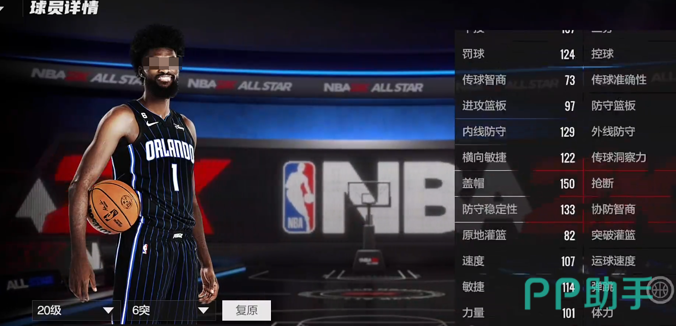 2米06的身高,224臂展,109的总评,模型不算特别突出,但是够用,投篮在右侧45度的三分算是热区,有着114的三分,具备一定的三分能力,105盖帽。暂时没有徽章,是平民玩家里比较好用的空间型内线,属于矮子里拔将军。
