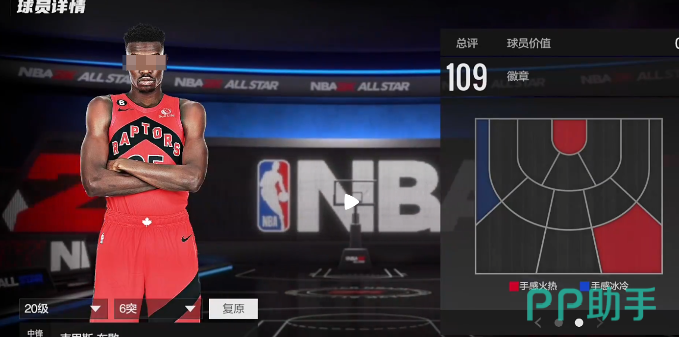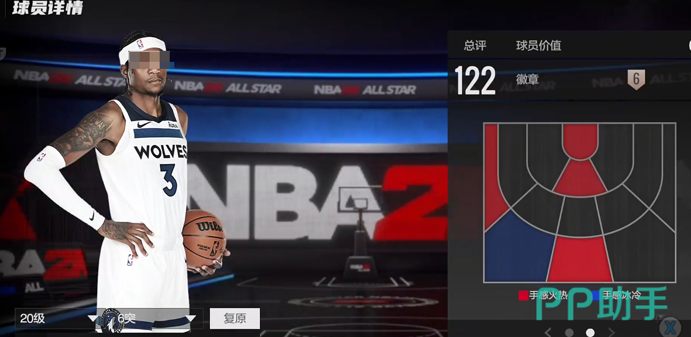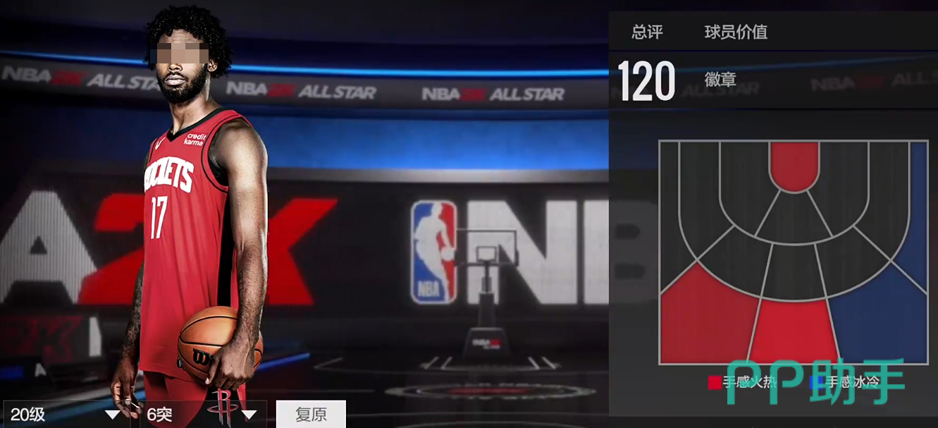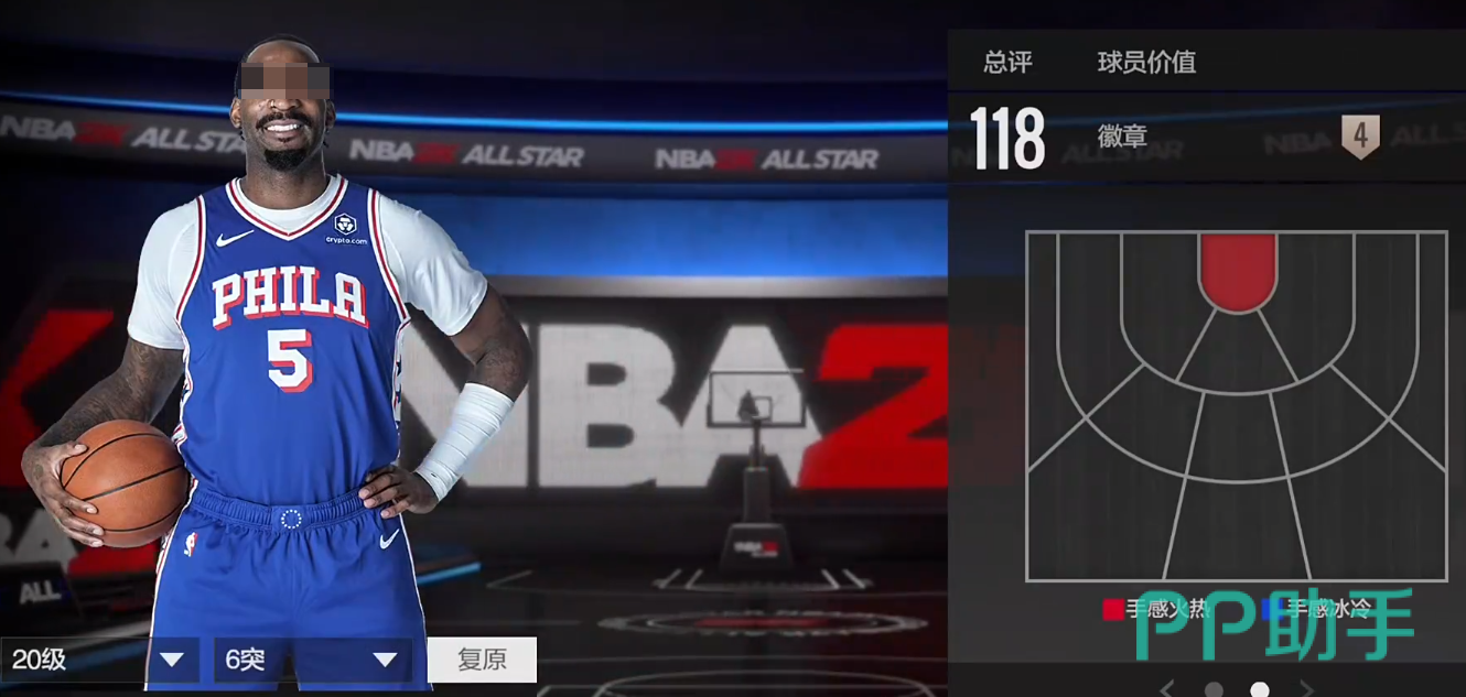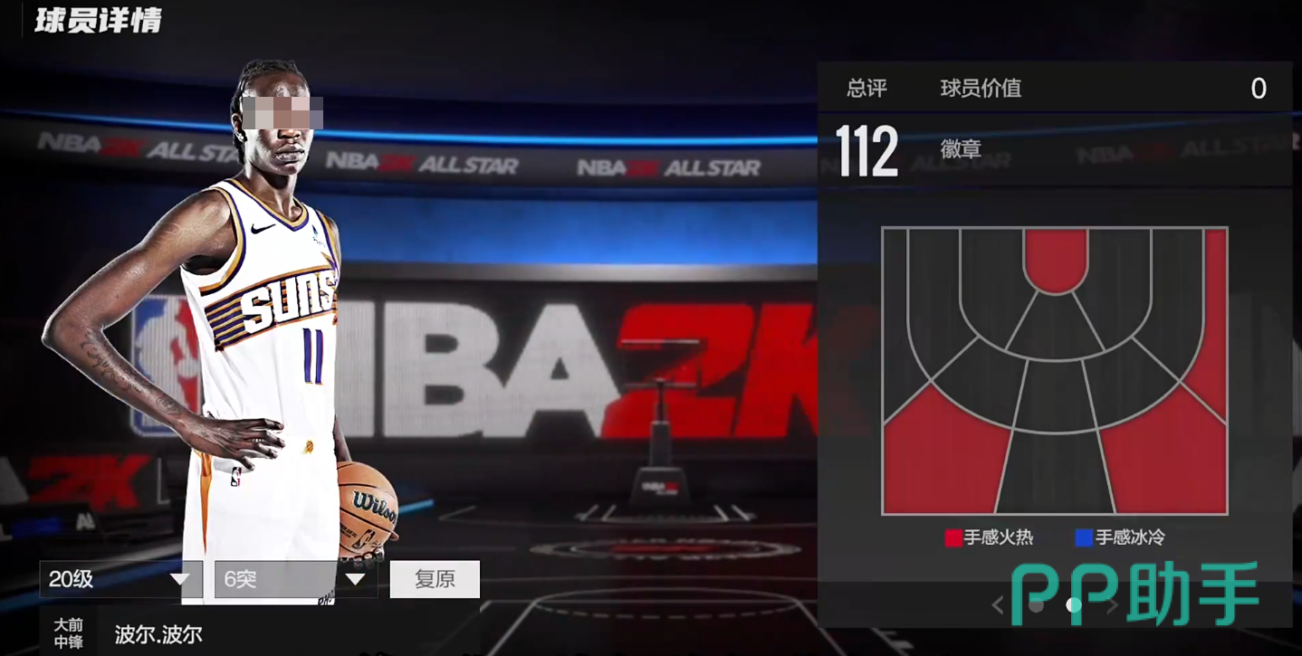 身高221,臂展231,总评112,模型有优势,热区也不错,在三分线两边45度以及右侧底角都是他的投篮热区,中投126,三分120,都超过了120的这个线,投射是具有威胁的。数值够用,有一定协防能力,但身材较为单薄,对抗一般,整体偏软,暂无徽章,但仅需2万,在这个档位算是模型怪,后继可能会涨价。