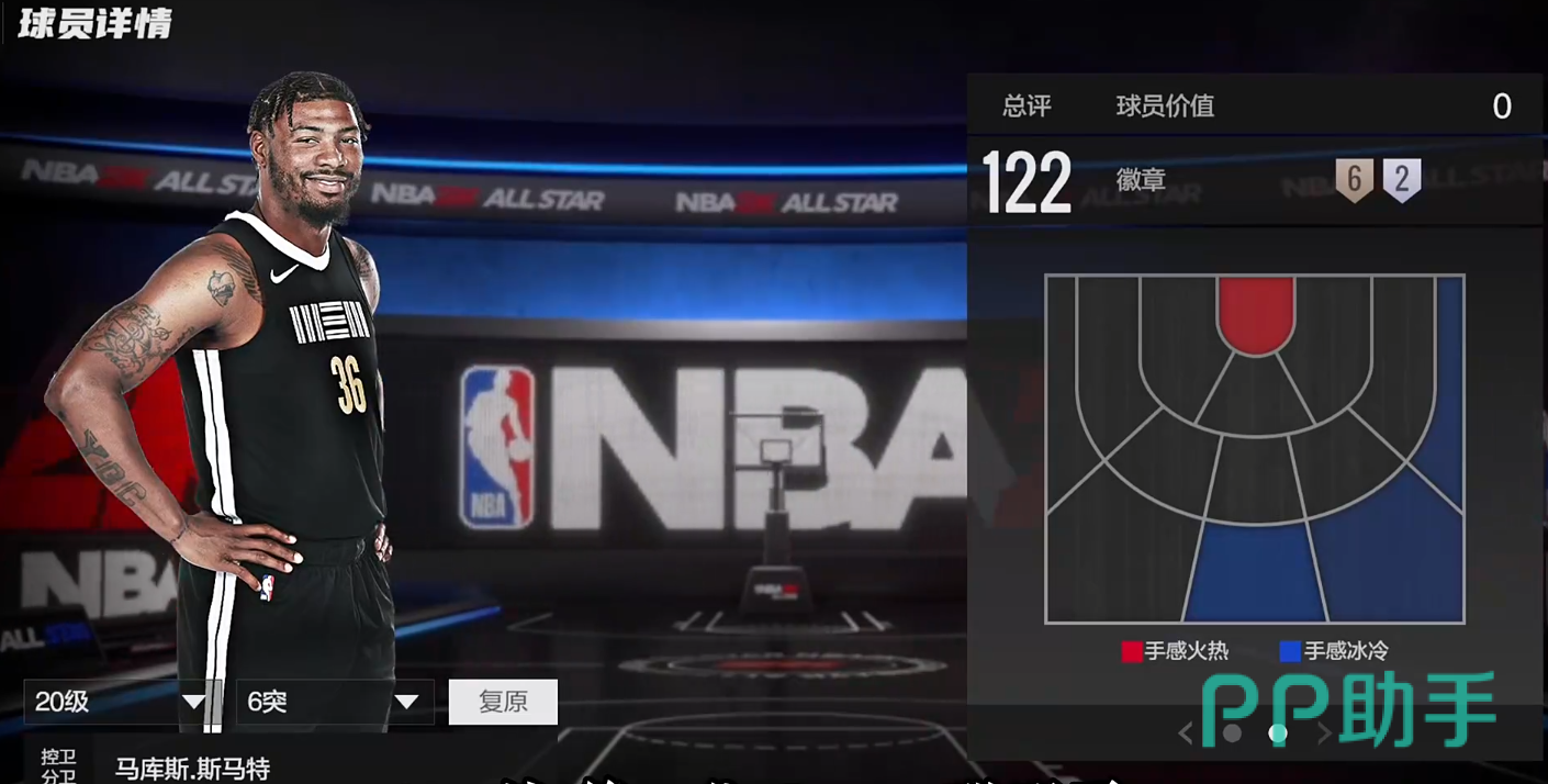 马库斯·斯玛特,俗称聪明哥,控卫分卫定位,总评122,投篮热区一般,但好歹是全区域覆盖,有一定的三分能力,内防和外防都不错,尤其是外防有147,横移抢断都很高。拥有徽章:弹跳大师(银)、争球狂人(银)、护踝(铜)、防守干扰(铜)、缠绕(铜)、盯防(铜)、无球跑位克星、挡拆躲闪者(铜)。总的来说是个非常优秀的外线防守者,外线防守很强,但其它方面有不小短板,适合锁后卫。