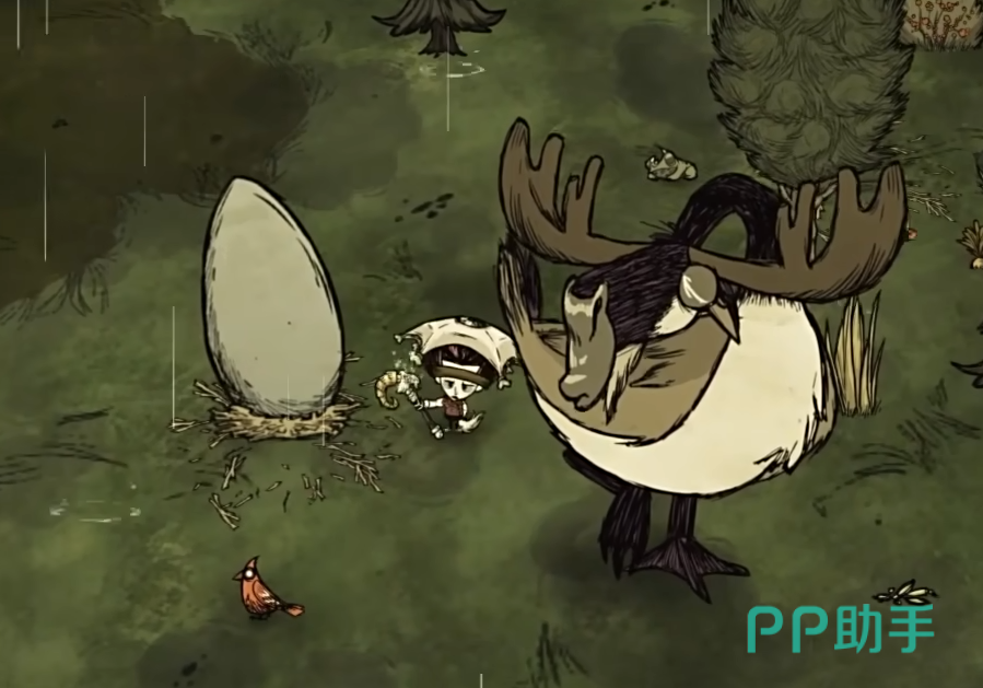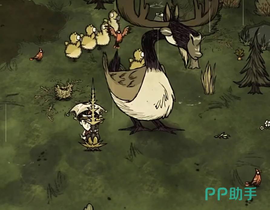 在冬天之后便是春天,而春天的BOSS便是麋鹿鹅还有它的幼崽。这个BOSS的幼崽在攻击的时候是不会长大的。在到了春天之后,咱们在地图上会经常看到有一个被树枝所围住的一圈的图案,这个便是鸟类的巢穴。咱们在地图之中有着一半的巢穴会有着很高的几率会刷新麋鹿鹅。在刷新了之后大概小半天它就会下蛋。在下蛋之后大概2天后便会顺利孵化,一般一个蛋一次可以孵化大概5只幼崽。咱们如果等不及孵化的话,也可以使用锤子将其给敲开,在敲的时候主要防电。