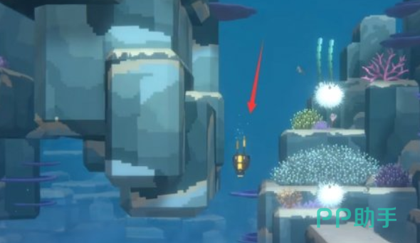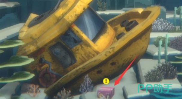 首先需要下海,不断向下能看到一个海洞,就沿着这个海洞一直向下走,等向下潜到右手边出现箱子的时候,就需要把下潜方向调整到西南方向,然后一路向前就能看到一个黄色的船只,这个就是快递沉船,在沉船的下方会有一个粉色的快递箱,上面还有黄色的感叹号标识,这就是玩家需要帮朋友拿回的快递箱。