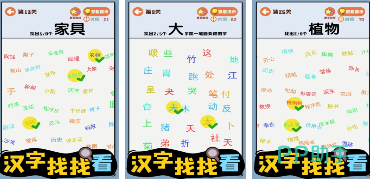 《汉字找找看》这款游戏是通过回答各种与汉字相关的问题来完成关卡挑战的。游戏界面包含题目区域、选择题域和提示区域等,只有正确选出答案才可以开启下一关。到目前为止,共有找茬、填空和分类等多种模式,而每个模式中的知识点也完全不同,玩的时候还可以了解到汉字的拼音、笔画以及其他知识。!