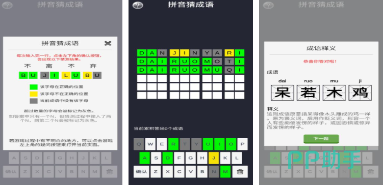 《拼音猜词语》的核心玩法就是根据拼音猜出相应的成语。游戏屏幕上方会给出相应的拼音,而这些拼音都是残缺的,你的主要玩法就是补全残缺的内容,并正确将成语拼写出来。如果答案正确的话即算通关,通关后还会有成语的解释。游戏并没有那些花里胡哨的界面,反而简洁明了,方便大家答题。