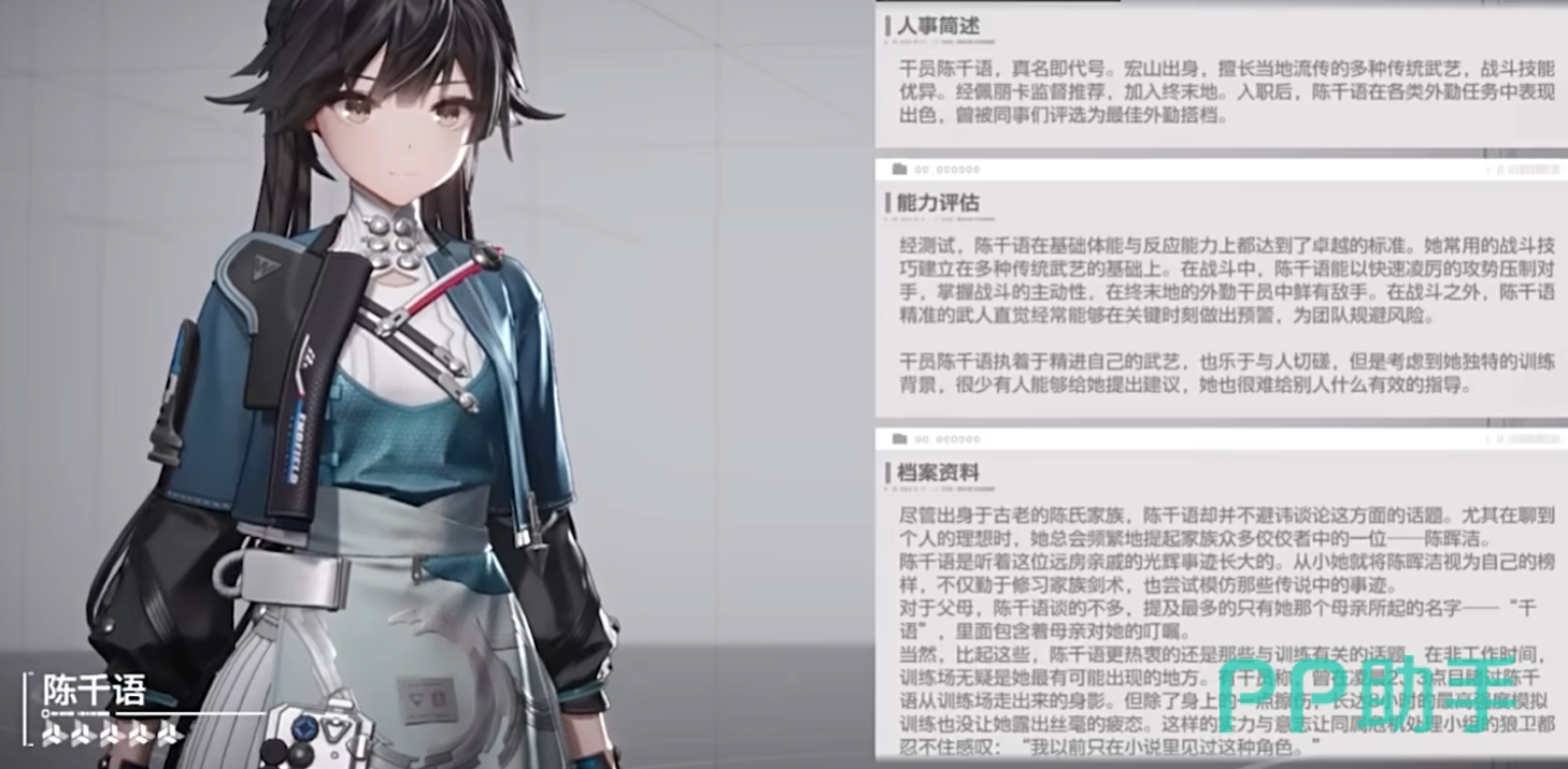 这个小陈其实说的就是干员陈千语,这是大家对她比较亲昵的称呼。这是终末地工业的特勤干员,还负责守护佩丽卡。本身体质天赋就比较高,还自幼学习战术以及武术,战力也是超强的。