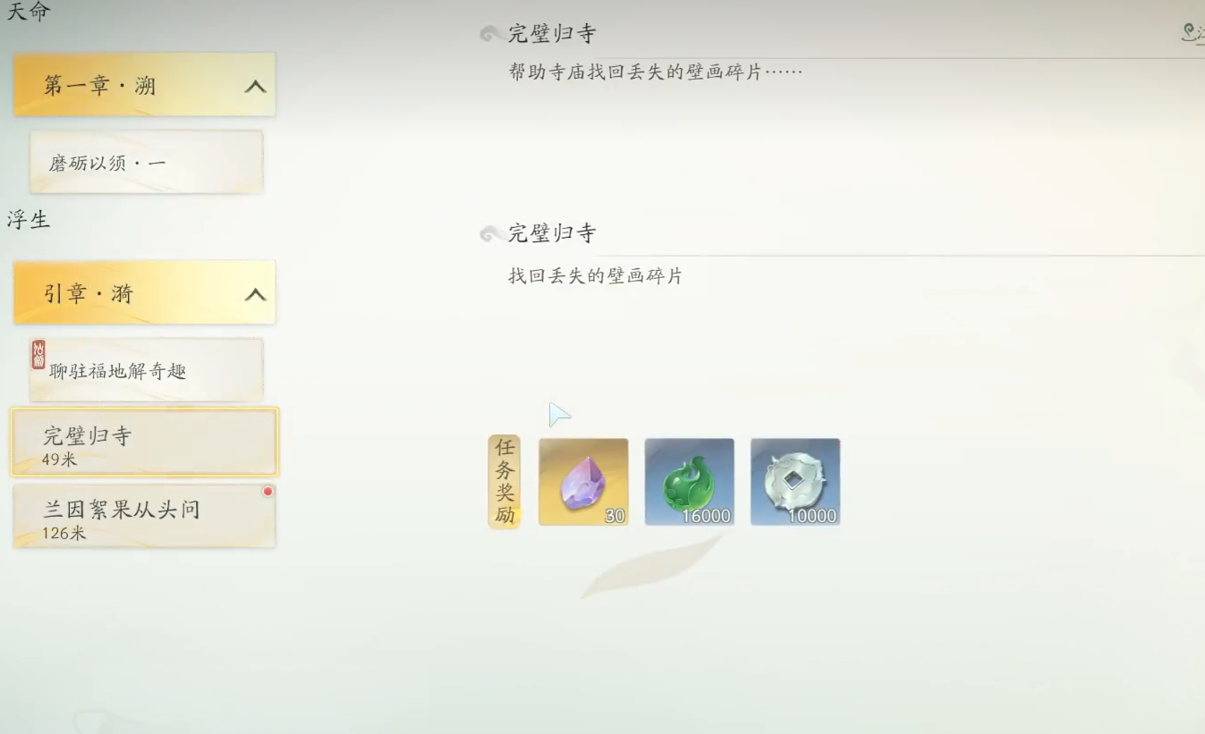 到达传送点之后玩家像地图右手边进行探索就可以找到对应的npc,在完成第一个任务之后玩家可以向寺庙中进行探索,第二个壁画碎片会随机刷新在区域中的酒坛中,玩家只需要击碎就能够拾取。