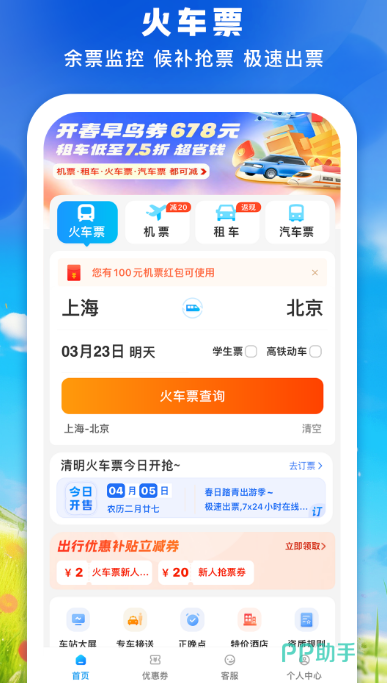 一站式出行平台,新客注册并使用将获得超大礼包,还有机票、火车票、高铁票、酒店等专属立减红包。订购火车高铁票相当便捷,只要输入目的地即可查询具体车次与发车时间,支持抢票选座、余票监控等多种模式,是出色的智能出行管家,尤其是春运、节假日出行人数较多时,每当监测到有余票会自动抢购。全国酒店支持预定,有特价酒店实时推送,享受优惠补贴。