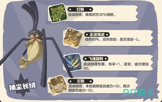 捕尘长绒的技能组合多样,既有攻击性技能,也有防御性技能,使其在战斗中能够灵活应对各种情况。钉刺是捕尘长绒的基础攻击技能,对敌方精灵造成物理损伤,并降低对手30%的物防效果,能够对敌人造成直接伤害,还能削弱敌人的防御能力,为后续攻击创造有利条件。