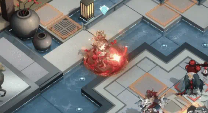 她是远击型器者,远程的输出爆发型器者。她的常击“喜乐喧天”,可对选定的敌方单体造成自身攻击力百分比的物理伤害;职业技能“锦绣红装”,使用后自身可获得一次不可移动的再行动,并进入瞄准状态,此状态下进行攻击时,最大攻击距离增加四格,行动结束后,退出该状态。