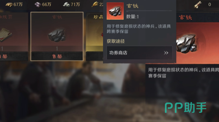 这时候就要提到“玄铁”了,神兵装备携带次数消耗完了后再放到仓库的时候会处于“磨损”状态,这个状态下无法使用,得用玄铁去修复才能再次取出。