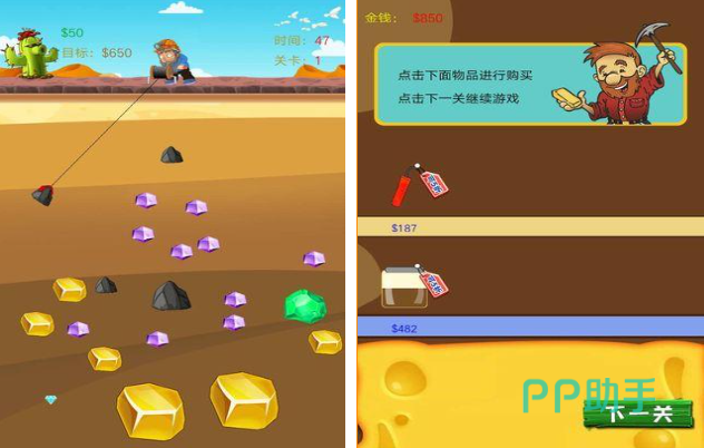 很有卡通风格的一款休闲类挖矿游戏。和黄金矿工的玩法比较相似,很容易上手,操作比较简单。在达到对应的分数之后,就可以迅速的开启接下来的关卡。玩家主要是通过发射钩爪的方式去获得对应的宝藏,玩家所需要做的就是把握时机比较考验预判能力。每一个关卡也会有对应的挑战难度,玩家就需要注意。