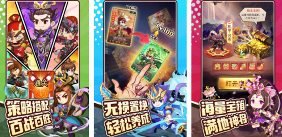 以非常刺激的三国为蓝本,设计时还将rpg以及战斗卡牌等多种元素巧妙融合,众多三国的优秀名将都是以卡牌的形式进行展现,玩家可通过随意卡组的方式打造出强大的战力系统。作为一方诸侯的你,要凭借着自己的实力过五关斩六将,还要手持炫酷的武器与之抗衡,并顺利通关。
