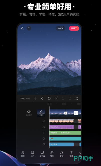 丰富的剪辑内容,无论视频还是音频,也都能在这款应用的帮助下完成,比如音乐剪辑、艺术文字,让你的作品脱颖而出。
