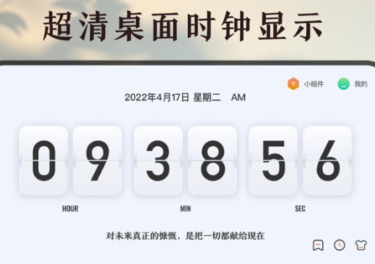 想要完成有效的时间管理,高效提高效率,桌面时钟属于相当热门的优质选择。简洁又醒目的界面几乎没有任何拒绝欲望,支持横屏竖屏两种不同的风格,精美皮肤任意切换。有倒计时提醒,重要的日期不再有记不住的情况。很多重要事情不要害怕忘记,只要添加倒计时时钟方便又省心。