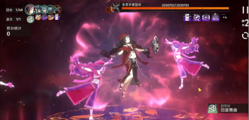 超限技“回旋舞曲”,直接消除全体友方2层负面效果,并根据自己最大生命为全体队友展开治疗,并为其添加一层“荒谬舞步”,超限技结束时,每个无负面状态的友方,将使阿莱夫获得能级;荒谬舞步在宿主造成伤害时,基于造成的伤害给宿主恒量治疗,触发后会消除一层,最多存在三层。