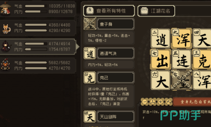如果小伙伴们将一通百通和狂风浪潮劲进行组合的话,可以获得新的特性北孤隐世动。这个特性同样比较适合喜欢玩剑的玩家们来使用,剑法伤害会增加20点,攻击力提升10%。同时增加5%的连击率,和20%的特殊武学伤害。