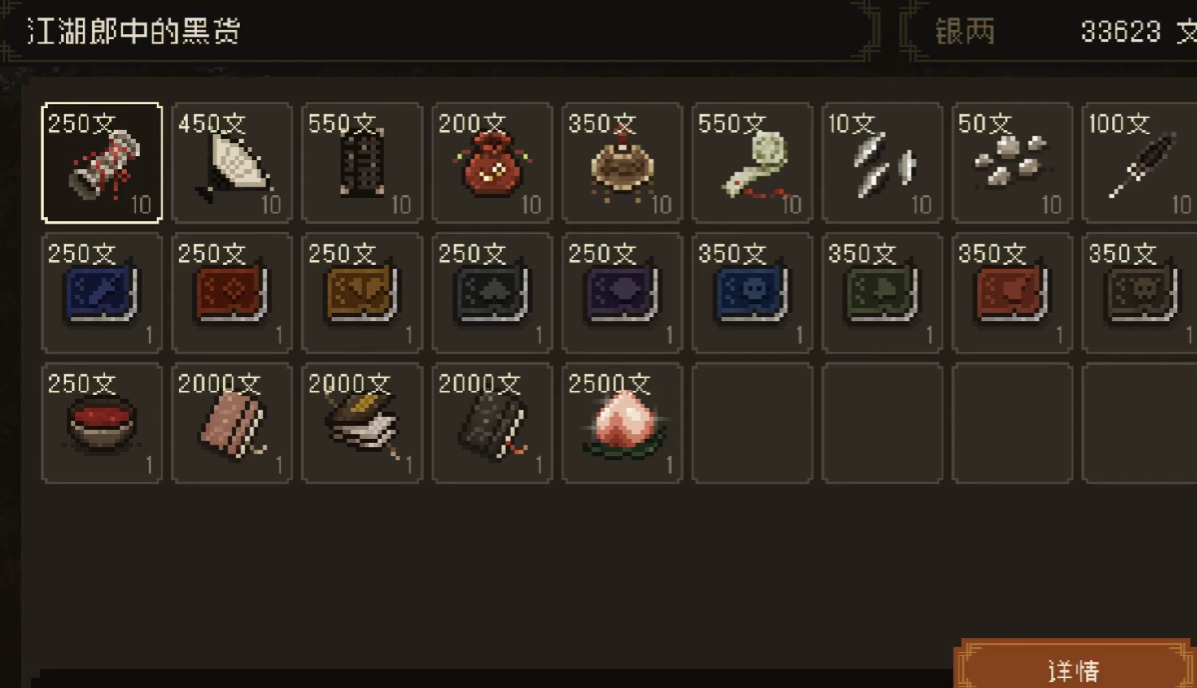 上面这些内容就是本次小编给大家专门带来的,大江湖之苍龙与白鸟潇湘地区解锁攻略的全部了,在正式解锁了潇湘地区后,玩家不要忘记前往到郊外处,寻找到一位江湖郎中,购买其黑货,在黑货之中有可能会刷新出蟠桃,希望看完这次内容的小伙伴们,可以进到游戏内体验一下哦~