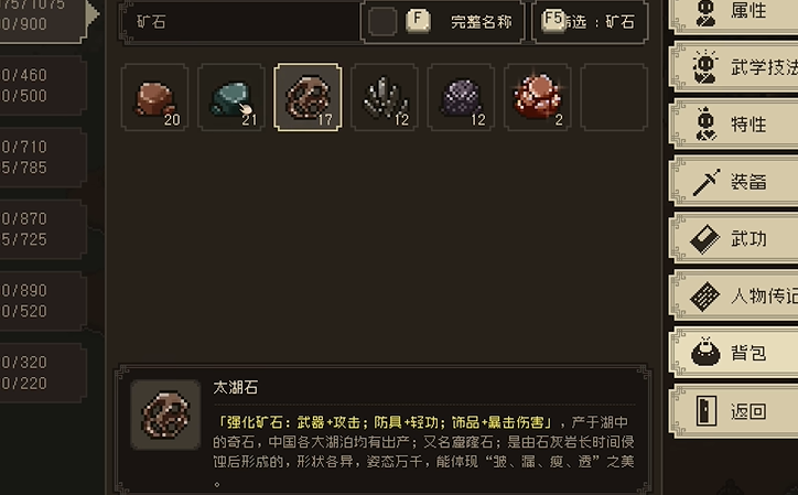 也可多探索有宝箱的地方,不少矿石在宝箱中获取,走到矿点或宝箱旁,点击相应的挖掘或开启按钮即可进行挖矿或开宝箱取矿操作,矿石种类非常多样,通远石可强化武器增加武器伤害、强化防具增加防御、强化饰品增加防御,太湖石强化武器可增加攻击、强化防具增加轻功、强化饰品增加暴击伤害,酒泉石强化武器增加攻击、强化防具增加内力、强化饰品增加酒艺伤害。