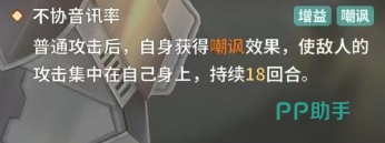 嘲讽效果也是安安的一个重点效果,一般是在普攻之后才能用嘲讽,这样就会让敌人的攻击集中在自己身上,持续 6 回合,战斗中当队友面临危险时,安安可以使用嘲讽效果吸引敌人的火力,让敌人攻击自己而不是队友,从而保证队友的安全,同时在承受敌人攻击的过程中,安安也可以利用这段时间合理地释放自己的技能,对敌人造成伤害或提供辅助效果。