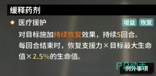 热尼亚的另一个重要技能是缓释药剂,这是一个医疗援护类技能,当她对目标施展此技能后,会为目标施加持续恢复效果,整个恢复过程能够持续5回合,在每一回合结束时,按照支援力目标最大生命值1%的比例为目标恢复生命值,当热尼亚的技能达到满级属性后,缓释药剂也进阶为医疗援护,此时每回合结束时的恢复量提升至支援力目标最大生命值2.5%,相比之前的1%,恢复效率得到了提高,能够更快地帮助队友回复生命值,除此之外触发完美护盾的话,当目标因生命药剂效果复活时,会自动获得伤害完全吸收护盾效果,在这一刻目标免疫所有伤害,当目标受到伤害时,其持续时间会变为1回合,