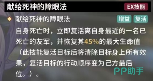 终极大招是献给死神的障眼法,当拥有者不幸死亡时,它会立即复活离自身最近的一名已经死亡的友军,并为其恢复45%的最大生命值,这不仅给予了队友第二次投入战斗的机会,而且所恢复的生命值足以让队友重新回到战斗序列,此技能复活目标后将清除目标身上所有效果,无论是之前承受的负面状态还是其他干扰效果,都会被一并抹去,让队友能够以全新的状态重返战场,同时复活后的队友行动顺序变为己方最后位。