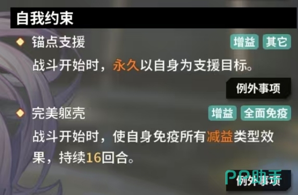 自我约束技能它被巧妙地设计为锚点支援效果,战斗一开始这个技能便会自动触发,其效果是永久地将自身设定为支援目标,完美躯壳效果则是在战斗开始时就可以使用,只要拥有者成功激活这个技能,就能够使自身免疫所有减益类型效果,这种免疫效果能够持续10回合之久,当达到满级属性时,完美躯壳技能也得到了进一步的强化升级,此时其免疫减益类型效果的持续时间延长至16回合。