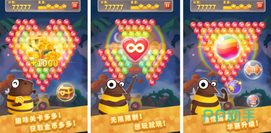 色彩丰富的画面,再搭配上简单的操作方式,会让很多玩家欲罢不能。其中包括了关卡模式以及无尽模式,屏幕上方会呈现出色彩缤纷的泡泡,下方也会随机吐出一种颜色的泡泡,玩家通过瞄准并发射的方式,将相同颜色的泡泡放在一起就能消除。一次性消除众多泡泡之后,也可看到炫酷的连击效果,还能获得更高的分数。