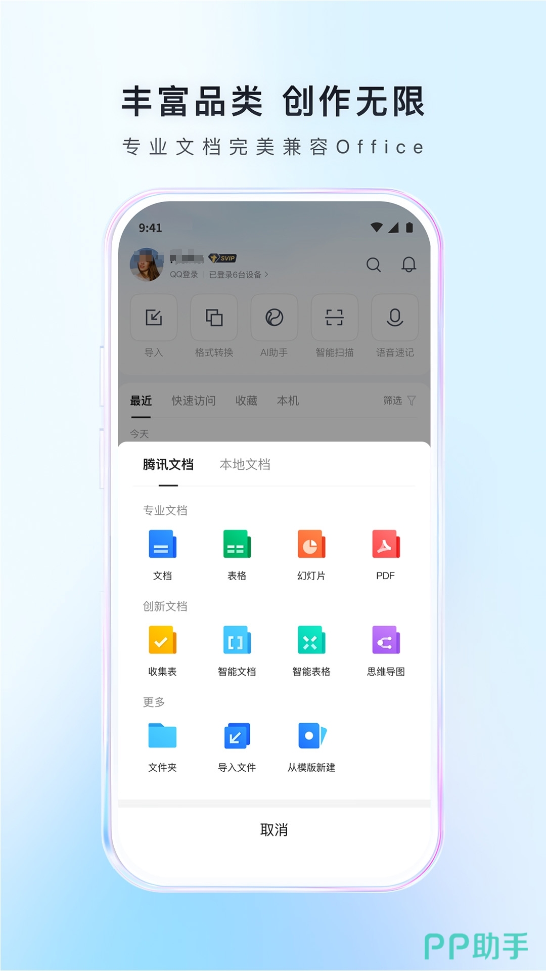 腾讯文档用的小伙伴也是比较多的,在这里大家不仅可以建立专业的文档,而且还可以创建新的文档,甚至是可以导入自己的本地文件,各种应用方式应有尽有,而且也可以在线编辑,甚至还可以邀请其他人一起进行编辑。